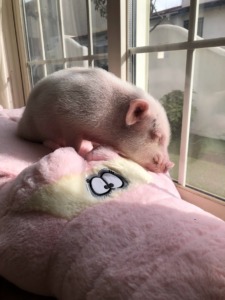 大人の白いブタはいわゆる「ブタ!!」で丸々太ってかわいかったことから白を選択しました。見た目はピンクにみえるけれど、毛の色は「白」で地肌のピンクが見えるためにピンクっぽく見えます。