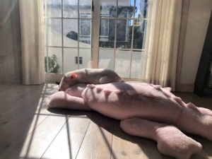 一番下に敷くトレーが居住部分とトイレ部分のあいだに山なりの仕切りがあってトイレにしっぱいしても居住区域に損害が出ないことも良い点。同じ柵内にトイレ場所と居住空間があると嫌がるかな、と懸念したのですがうちのこもぶーは大丈夫なようで寝るときはこの小屋の中に置いたクッションの上で寝てくれています。室内では放し飼いなので昼間は日なたを追いかけて移動して過ごすのでもっぱら小屋の外ですが。