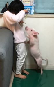 年長の次女は積極的にごはんやトイレの世話をしてくれます。ブロッコリーの芯をじらしながらこもぶーにあげています。マイクロブタは肉球じゃなくて蹄なので、立ち上がって蹄がうまい具合に頼ってくる足に刺さってくると痛い。マイクロブタも短い後ろ足とちょっとの接点しかない後ろ足の蹄で頑張って立ち上がります。早くくれブー!