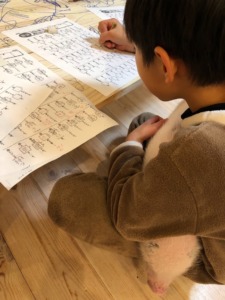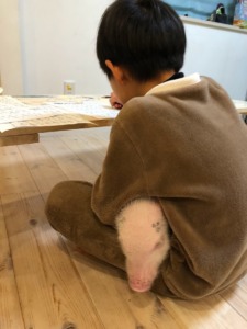 実体験から学ぶとは。そんな、がんばる長男のもこもこのパジャマがあったかい。こもぶーはちゃっかりひざに乗って勉強を応援。そんな夕飯後の一コマ。