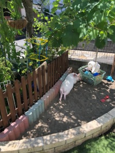 真夏のマイクロブタは器用に砂場上部の温まった砂を鼻先で掘り掘りして、中の冷たい砂におなかをつけて風に吹かれながらお昼寝。