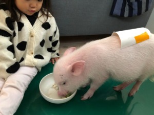 「散歩に行きますよー」とえさを食べている最中に背中にトイレットペーパーの芯を取り付けられていた。